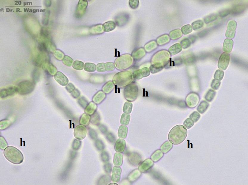 Tato sinice (viz obrázek 2) vytváří nevětvená vlákna, jenž obsahují tři typy buněk (vegetativní buňky, heterocyty a akinety). Heterocyty (h) jsou tlustostěnné buňky, které pomocí enzymu nitrogenáza fixují vzdušný biatomární dusík (N2). Právě tato schopnost umožňuje sinicím vstupovat do velké řady symbiotických reakcí nejen s vyššími rostlinami, ale také s mechorosty – viz dále3. Akinety jsou klidové buňky, které slouží k přezimování, resp. obecně k přečkání nepříznivých podmínek4.