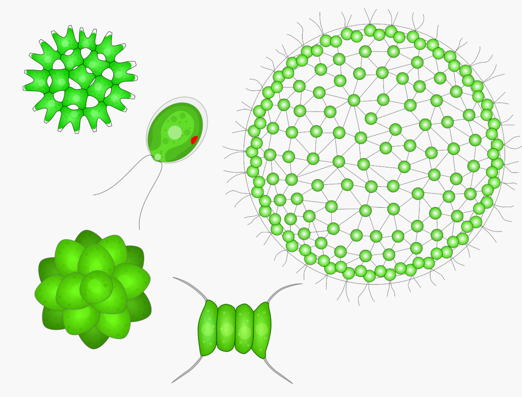 - Volvox (česky váleč) – obrovské kolonie z buněk uložených po obvodu duté koule; plankton čistých stojatých vod