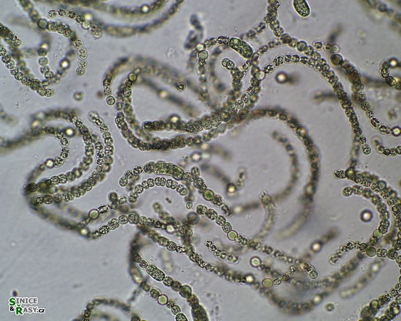 - Dolichospermum (dříve Anabaena) – planktonní rod, symetrická vlákna s heterocyty a akinetami