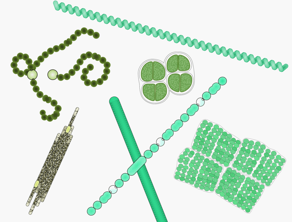 - Microcystis – kulovité buňky, tvoří kolonie nepravidelného tvaru obalené slizem; má aerotopy; plankton sladkých vod