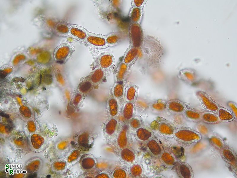 - Trentepohlia – oranžové zbarvení, porůstá povrchy skal a kmeny stromů, velmi běžná i v našich podmínkách, zejména na listnatých stromech