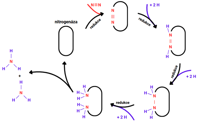 A nyní již k samotnému procesu. Fixace vzdušného dusíku je cyklický proces, jeho zjednodušené schéma je zobrazeno níže. Na nitrogenázu v heterocytu se naváže molekula N2 – opět připomeňme, že mezi atomy dusíku je trojná vazba, tedy oba dusíky mají celkem šest vazebných elektronů. V dalším kroku dojde k redukci, při které se uvolní dva vazebné elektrony dusíku. Do reakce dále vstupují dva atomy vodíku, které se navážou na uvolněné pozice. Vzniká molekula diazenu (HN=NH). Reakce pokračuje stejným způsobem i dále – z dvojné vazby se stane jednoduchá a na uvolněné pozice se navážou další dva vodíky. Tím vzniká molekula diazanu (H2N-NH2). Následuje poslední redukce, kdy se rozpojí jednoduchá vazba mezi atomy dusíku a znovu dojde k navázání vodíků. Vzniknou dvě molekuly amoniaku (NH3). Tyto se odloučí od nitrogenázy a pokračují dále svou cestou, čímž se nitrogenáza uvolní pro navázání další molekuly N≡N a celý proces může pokračovat dále5.