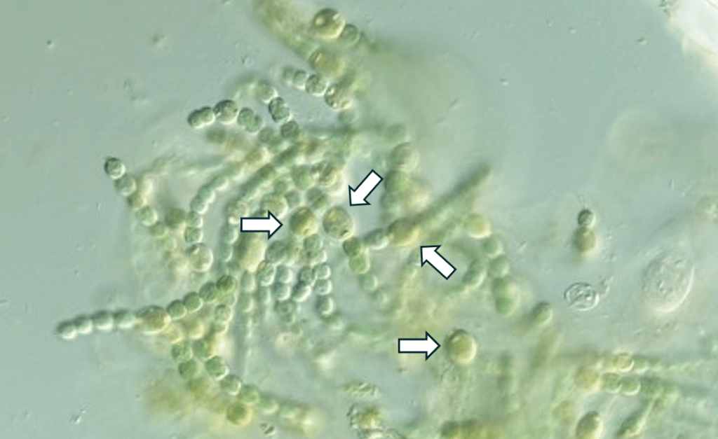 Tou je nepřítomnost kyslíku. Nitrogenáza totiž obsahuje atomy železa, které je na kyslík velmi citlivé. Některé sinice si proto vyvinuly specializované buňky, tzv. heterocyty. Ty jsou od kyslíku zcela izolované, a jsou v nich tedy ty správné podmínky pro setrvání nitrogenázy4. Na fotografii je k vidění heterocytózní sinice Trichormus azollae (tu si zapamatujte, později se s ní ještě setkáme).